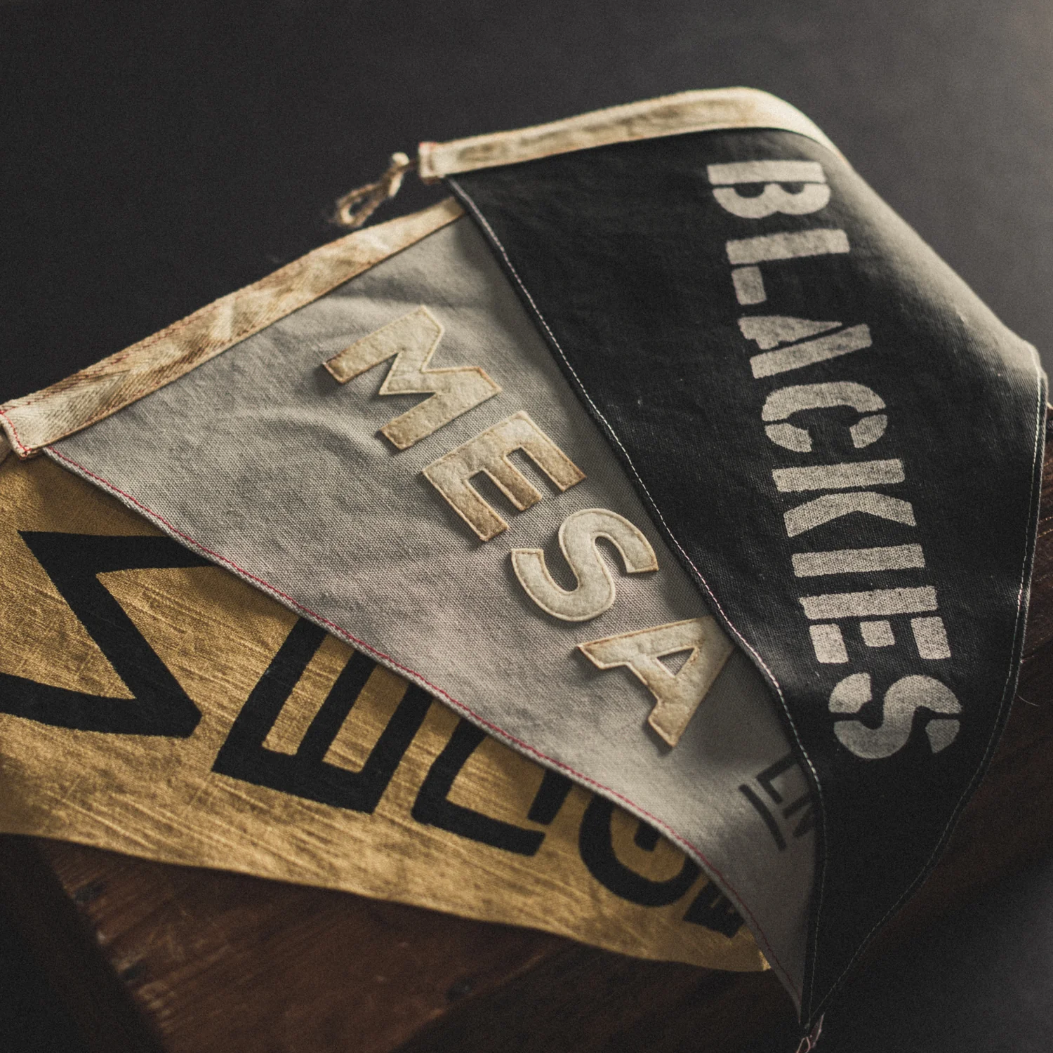 Each flag is hand-painted, stitched and prepared to be hung with photo, art or object collections